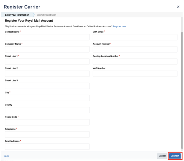 - Fill out the registration form with your Royal Mail account information, then click the Connect.